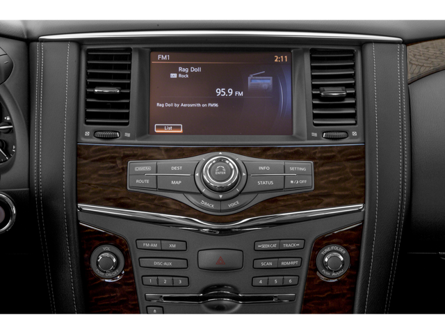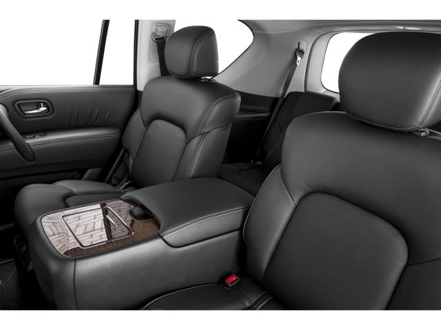 Cargo Package, 4WD, 13 Speakers, 2.937 Axle Ratio, 2nd & 3rd Row Carpeted Mats, 3rd row seats: split-bench, 4-Wheel Disc Brakes, A/V remote, ABS brakes, Activation Disclaimer, Air Conditioning, Alloy wheels, AM/FM radio: SiriusXM, Anti-whiplash front head restraints, Auto tilt-away steering wheel, Auto-dimming door mirrors, Auto-dimming Rear-View mirror, Auto-leveling suspension, Automatic temperature control, Brake assist, Bumpers: body-color, CD player, Delay-off headlights, Driver door bin, Driver vanity mirror, Dual front impact airbags, Dual front side impact airbags, Electronic Stability Control, Emergency communication system: NissanConnect Services, Four wheel independent suspension, Front anti-roll bar, Front Bucket Seats, Front Center Armrest, Front dual zone A/C, Front fog lights, Front reading lights, Fully automatic headlights, Garage door transmitter: HomeLink, Headphones, Heated & Cooled Front Bucket Seats w/Driver Memory, Heated door mirrors, Heated front seats, Heated rear seats, Heated steering wheel, Illuminated entry, Lane Departure Warning System, Leather Shift Knob, Leather-Appointed Seat Trim, Low tire pressure warning, Memory seat, Navigation System, Occupant sensing airbag, Outside temperature display, Overhead airbag, Overhead console, Panic alarm, Passenger door bin, Passenger vanity mirror, Power door mirrors, Power driver seat, Power Liftgate, Power moonroof, Power passenger seat, Power steering, Power windows, Radio data system, Radio: Bose AM/FM/SXM/CD/MP3/HD Radio, Rain sensing wipers, Rear air conditioning, Rear anti-roll bar, Rear reading lights, Rear seat center armrest, Rear window defroster, Rear window wiper, Reclining 3rd row seat, Remote keyless entry, Roof rack: rails only, Security system, Speed control, Speed-sensing steering, Speed-Sensitive Wipers, Split folding rear seat, Spoiler, Steering wheel memory, Steering wheel mounted audio controls, Tachometer, Telescoping steering wheel, Tilt steering wheel, Traction control, Trip computer, Turn signal indicator mirrors, Variably intermittent wipers, Ventilated front seats, Voltmeter, and Wheels: 20 Machine-Faced Chrome w/Tinted CC.